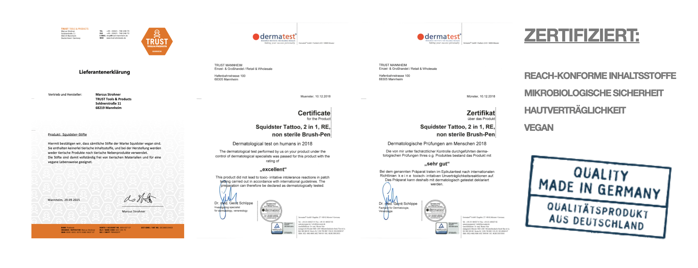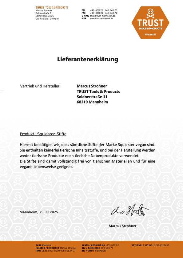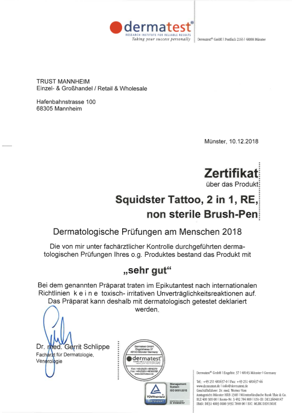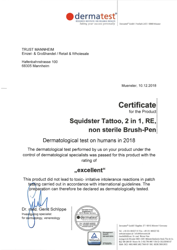 Egal ob groß oder klein, Piercing oder Tattoo, SQUIDSTER ist der perfekte Begleiter, um deine Ideen auf der Haut zu manifestieren. Du möchtest mit Pinsel und Marker arbeiten und verschiedene Texturen erzielen? Kein Problem! Unser SQUIDSTER bietet dir beide Optionen in sieben verschiedenen Farben. Benutze die Skinmarker für Zeichnungen direkt auf gereinigter Haut und/oder zum Markieren – die Farbe hält selbst beim Tätowieren und verwischt nicht. Für bestmögliche Ergebnisse verwende den SQUIDSTER auf möglichst trockener, fettfreier und gereinigter Haut. Das Resultat wird noch haltbarer, du eine kurze Einwirkungszeit berücksichtigst. Um die Farbe von der Haut zu entfernen, könnt ihr Alkohol für größere Flächen und unseren SQUIDSTER Eraser für Details nutzen. Dieser lässt sich ebenfalls zum Farben mischen direkt auf der Haut nutzen. Unser SQUIDSTER Skinmarker ist 100% tierversuchsfrei, dermatologisch getestet, vegan und individuell in sieben verschiedenen Farben erhältlich. Die Art der Verpackung, EO sterilisiert oder unsteril, ist dir überlassen.